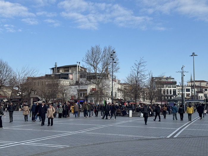 This image depicts a wide-angle view of Eminönü Square in Istanbul, Turkey, under a clear blue sky with scattered white clouds. The scene is illuminated by natural daylight. The foreground features a large, light-gray paved square marked with white lines forming a grid pattern. Dozens of pedestrians, of various ages and wearing winter or early spring attire (coats, jackets), are dispersed across the square, walking in multiple directions. No specific individuals are in sharp focus due to the distance. The midground and background consist of a cluster of multi-story buildings and numerous deciduous trees with bare branches. On the right side, a prominent building displays signage, including "MANDALIN DÜNYA MUTFAĞI." Other buildings exhibit varied architectural styles, some with visible rooftop structures or terraces. Tall, dark-colored streetlights with multiple fixtures are positioned on both the left and right sides of the square. A notable spire-like structure is visible above the buildings on the far right. No vehicles are present within the visible confines of the square. The overall impression is that of a busy urban environment.