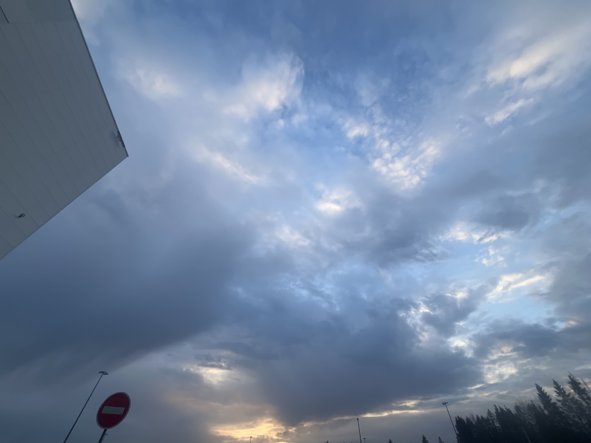 Captured in Ромашка Нп, Russia, the image features a cloudy sky with varying shades of blue and gray. A portion of a white building occupies the upper left corner. A "no entry" sign is visible on the lower left. Silhouetted trees and streetlights dot the horizon.