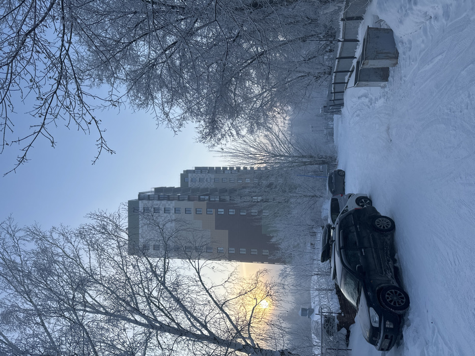 A winter scene features snow-covered ground and trees with frost-covered branches. A tall building with a beige and brown facade stands in the background. Several parked cars are visible along the right side, and a line of metal containers sits further back. The sky is a pale blue, and a hazy sun shines through the trees, creating a warm glow. The image is oriented vertically.