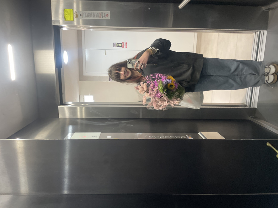 In an elevator, a woman faces her reflection in the mirror holding a colorful bouquet with a sunflower visible. She wears a dark hoodie, wide-leg jeans, and platform shoes. The elevator's interior consists of stainless steel and dark paneling, reflecting a doorway. The lighting inside is bright, highlighting the woman and the details of the elevator's design.