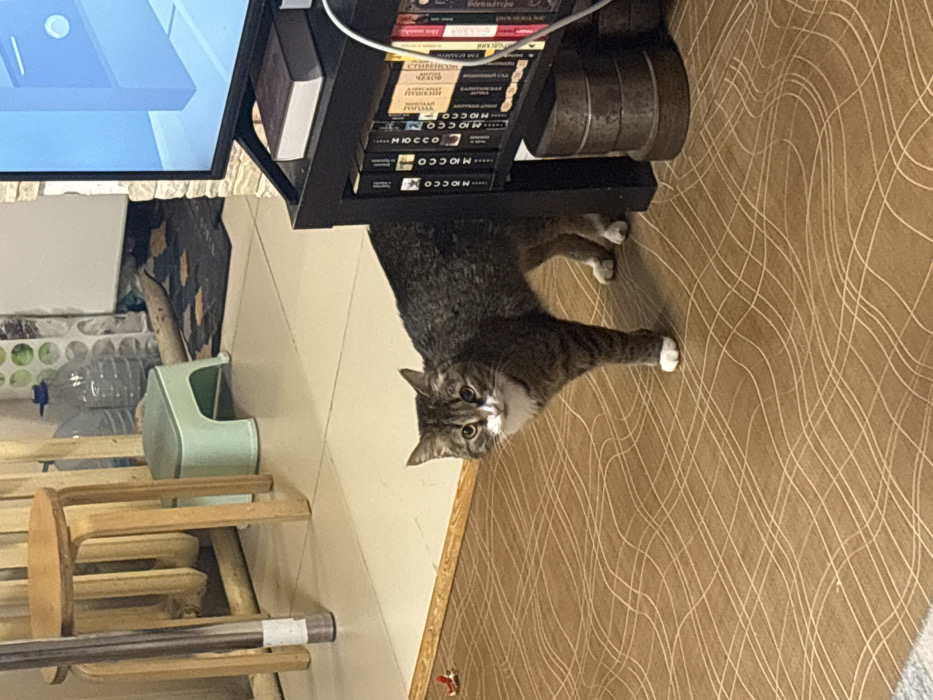 The scene depicts an interior domestic environment in Krasny Klyuch, Russia, featuring a tabby and white cat standing on patterned brown flooring