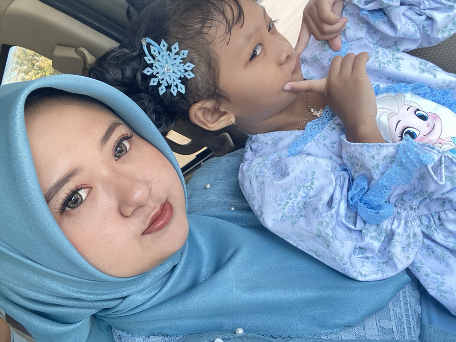 A close-up photograph depicts two individuals, an adult female and a young child, situated within what appears to be the interior of a vehicle, in Pamotan, Indonesia. The adult female, positioned in the upper left, presents with light-to-medium skin, dark eyes exhibiting light-colored contact lenses, and defined eyebrows. She wears a light teal hijab covering her head and neck, paired with a matching garment featuring white pearl embellishments and lace detailing. A nose ring is visible on her right nostril, and her lips are colored with a brownish-pink hue. She looks directly at the camera. To the lower right, a young child is partially visible. This child has a darker complexion, dark hair secured with a light blue snowflake-shaped hair clip containing a central gem, and wears a small gold hoop earring in the left earlobe. The child's attire consists of a light purple long-sleeved shirt patterned with green and white florals, accented with blue lace trim and ribbons. A graphic of the character "Elsa" from Disney's Frozen is visible on the front of the shirt. A delicate gold chain necklace with a small charm adorns the child's neck. The child's right index finger is positioned against the cheek/mouth, and the left hand's thumb touches the chin, as the child looks away from the camera towards the right. The background is out of focus, showing indistinct shapes indicative of a vehicle's interior and ambient daylight.