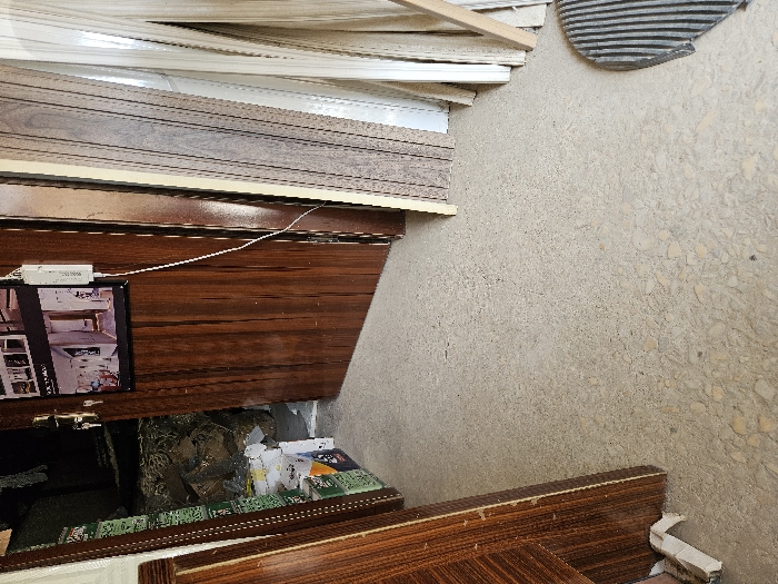 The scene is an interior space in Dadi Riba, Nigeria. The floor is a light-toned terrazzo with embedded aggregate. No individuals are present. A dark brown, wood-grained panel is partially visible on the far left. Adjacent, an open doorway reveals a dimly lit storage area containing vertically stacked green and white branded boxes and an amorphous pile of materials. A central dark brown, wood-grained door is ajar, featuring a silver-colored handle with a key attached. A framed picture depicting interior scenes is affixed to this door, with a white cable descending from a small, white rectangular device positioned near the top right of the frame. On the right, various wood-grained and light-colored panels are vertically propped against a wall. A dark gray, ribbed mat is partially visible on the floor in the lower right.