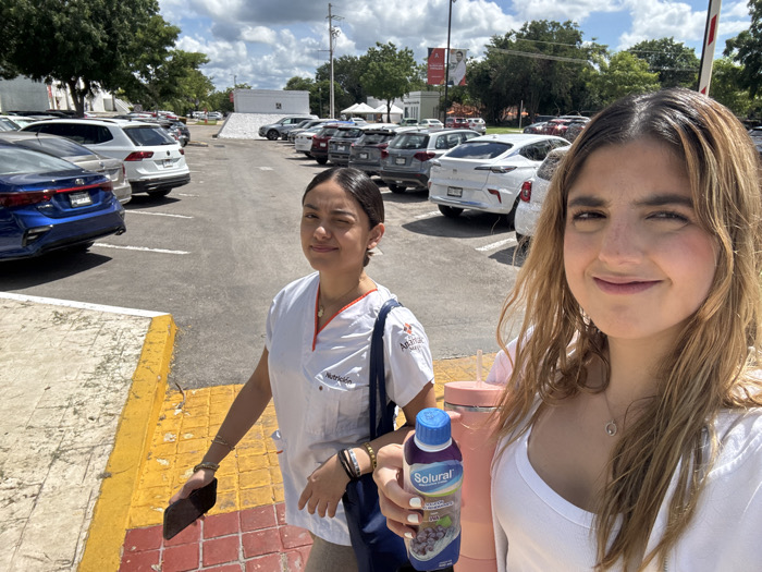 two young adult females in an outdoor parking lot in Chablekal, Mexico, under a partly cloudy sky. The woman in the immediate foreground, positioned on the right, has light brown hair and is wearing a white top with a necklace. She smiles directly at the camera while holding a pink tumbler in her left hand and a purple-labeled "Solural" grape-flavored bottle in her right hand. To her left and slightly behind, a second woman with dark hair tied back wears a white medical scrub top with orange trim, bearing "Nutrición" and "Anáhuac Mayab" logos. This woman is winking with her left eye and smiling, holding a dark smartphone in her right hand. They are standing on a paved surface with a distinctive yellow and reddish-brown tiled curb to their left. The background reveals a large asphalt parking lot filled with numerous parked vehicles, including sedans and SUVs of various colors. Trees, a white building, and a red-and-white striped barrier arm are visible further in the background, consistent with the campus of Universidad Anáhuac Mayab.