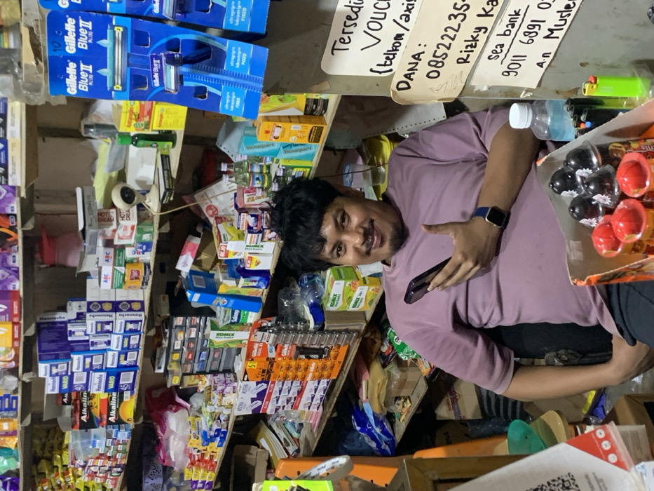 The scene depicts a small, densely stocked retail shop in Lhokseumawe, Indonesia
