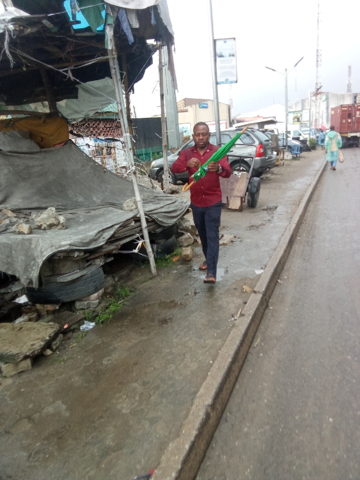 The image displays an outdoor street scene in Satellite Town, Nigeria, under an overcast sky, with visible wet concrete and asphalt surfaces, indicative of recent precipitation. In the foreground, a dilapidated, makeshift stall occupies the left side. It is constructed from various materials including corrugated metal sheets, wooden posts, and multiple grey tarpaulins. The base features stacked discarded tires and bricks, supporting a platform where various items, including bundles of rolled, copper-toned pipes, are stored and covered. Loose concrete debris and scattered litter are present around the stall's base. An adult male, of dark complexion with short dark hair, is the central subject, walking towards the viewer on the wet concrete sidewalk. He is dressed in a long-sleeved red button-down shirt, dark trousers, and brown flip-flops. He holds a closed green umbrella with a prominent wooden handle, adjusting or securing it with both hands. To the right of the male, a concrete curb separates the sidewalk from a dark asphalt road. Several vehicles are parked along the road, including a dark grey SUV/station wagon and a wooden two-wheeled handcart positioned behind it. Further down the road, a second individual, wearing a light blue or green rain jacket and carrying a light-colored bag, walks away from the viewer on the asphalt. The background features various urban elements: multiple buildings, streetlights, a utility pole with a white rectangular sign, and a distant communication tower. A large commercial truck carrying red shipping containers is visible on the far right side of the road.