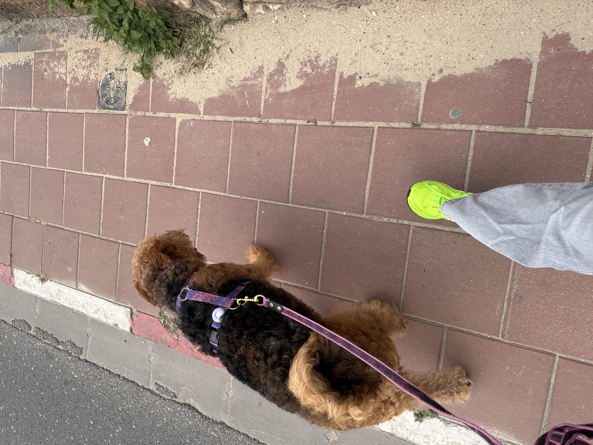 A top-down shot shows a brown and black dog wearing a purple harness and leash, lying on a red brick sidewalk in Ramat Gan, Israel
