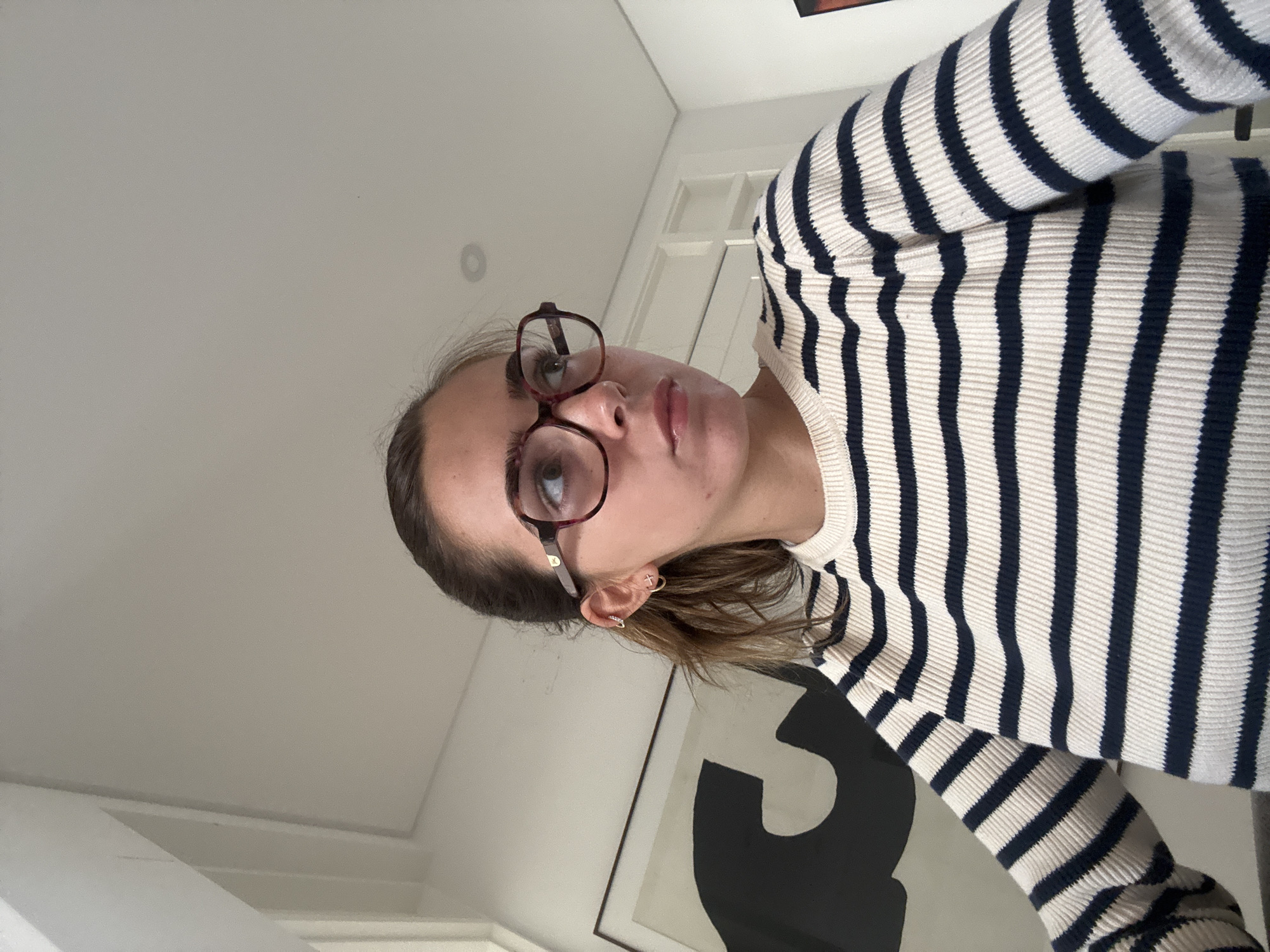 The image depicts a female subject positioned in a close-up, slightly low-angle view within an interior setting in Vila Nova de Gaia, Portugal. The subject has brown hair, partially pulled back, and is wearing hexagonal brown-rimmed glasses. Her eyes are directed upwards and to the right, and her mouth is slightly ajar. She wears multiple gold-toned ear piercings, including small hoops and a cuff. Her attire consists of a cream-colored ribbed long-sleeve sweater featuring horizontal navy blue stripes. The background comprises a light-colored wall. To the left, a portion of a large framed artwork displaying abstract black shapes on a white background is visible. To the right, white interior architectural molding, possibly part of a doorframe, and a circular recessed light fixture in the ceiling are present.