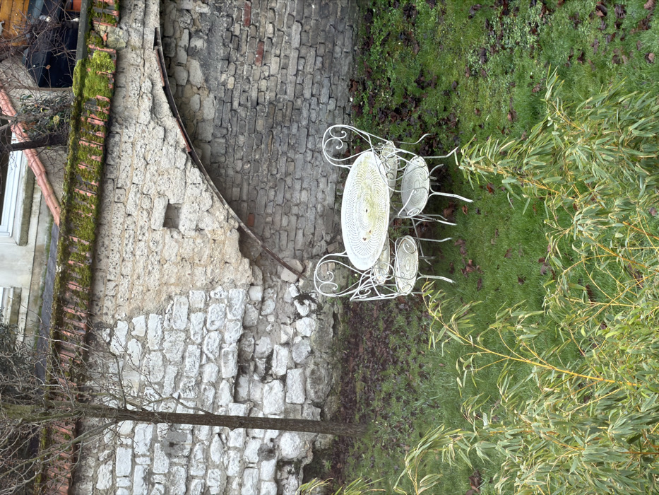 This image depicts a residential garden or courtyard scene in Reims, France, under overcast conditions