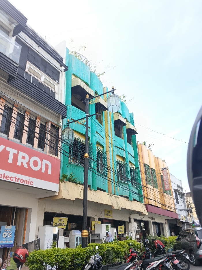 street scene with a mix of commercial buildings. A building with a turquoise facade stands prominently, featuring Art Deco elements and signs that read "JUAL OBRAL". Adjacent to it is a building with a sign that says "TRON electronic". Several motorcycles are parked in front of the buildings, and there's a row of green bushes separating the sidewalk from the street. A street lamp stands tall.