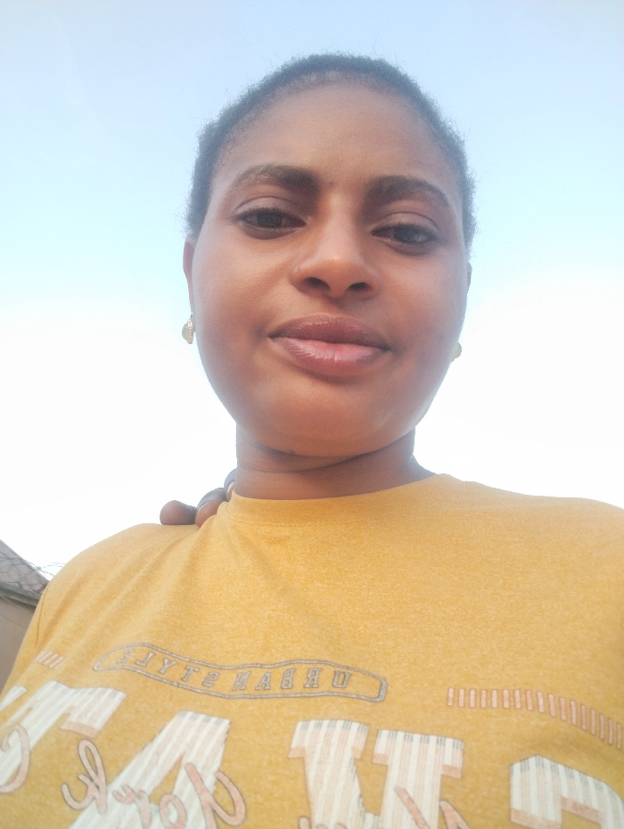 A person with short hair, dark eyes, and full lips is centered in the frame. They wear a mustard-colored t-shirt with a graphic design on the front. The background is a light blue sky. The person is facing the camera with a slight smile. The image is a close-up shot, focusing on the face and upper body. A glimpse of a building is visible on the lower left side.