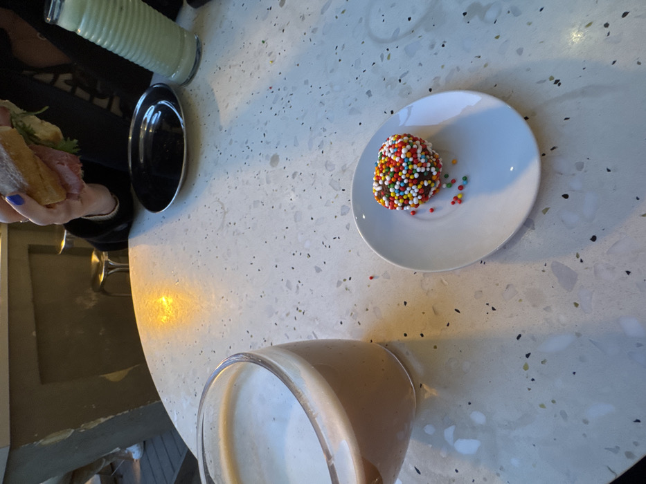 A white speckled table holds a green smoothie, a small black plate, and a white plate with a sprinkle-covered chocolate ball. A sandwich is visible in a person's hand. A glass of milky coffee is also on the table.