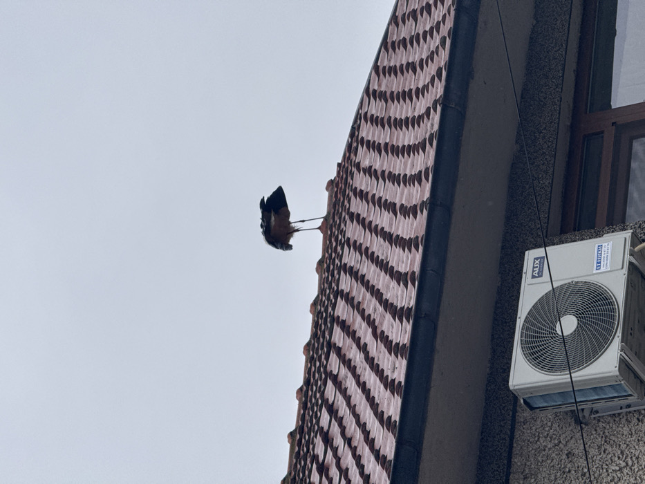 - "The image captures a dark-colored bird, identified as a stork, standing on a red-brown tiled rooftop under an overcast sky in Dobrich, Bulgaria" by FM-s19923, licensed under CC BY 4.0