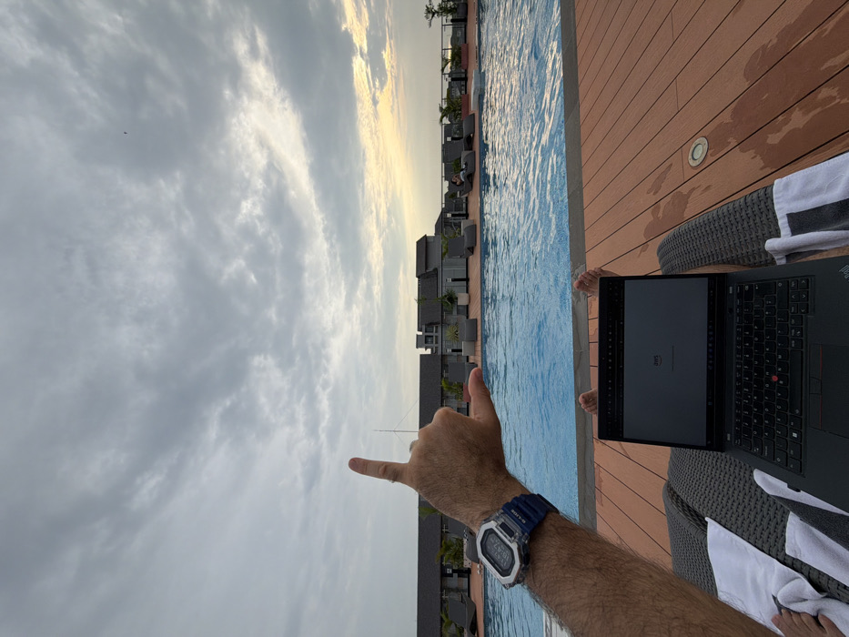 - "A first-person, low-angle view captures a scene at a rooftop swimming pool in Canggu, Indonesia, during overcast conditions with a visible sunset or sunrise glow on the horizon" by FM-PcEqo1, licensed under CC BY 4.0