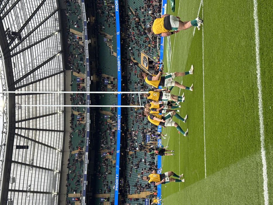 The image depicts a rugby stadium, identified as Twickenham Stadium, located in Twickenham, London, United Kingdom. A group of approximately ten male rugby players, wearing green shorts, green socks, and yellow bibs over green shirts, are present on a well-maintained green grass pitch marked with white lines. Two tall white rugby goalposts stand centrally on the pitch. The players are in various active postures, suggesting a warm-up or practice session. One player on the far left walks towards the left, while another in the right foreground has his back to the viewer, leaning forward. In the background, tiered stadium seating, predominantly green with some blue sections, is partially filled with numerous spectators. Advertising banners, including "Allianz Stadium," "PRIORITY," and "O₂," are visible along the stands. The stadium's roof structure, comprising a metal framework and translucent panels, extends above the seating area. A dark-clad individual with a red item is observed near the center-left among the players.