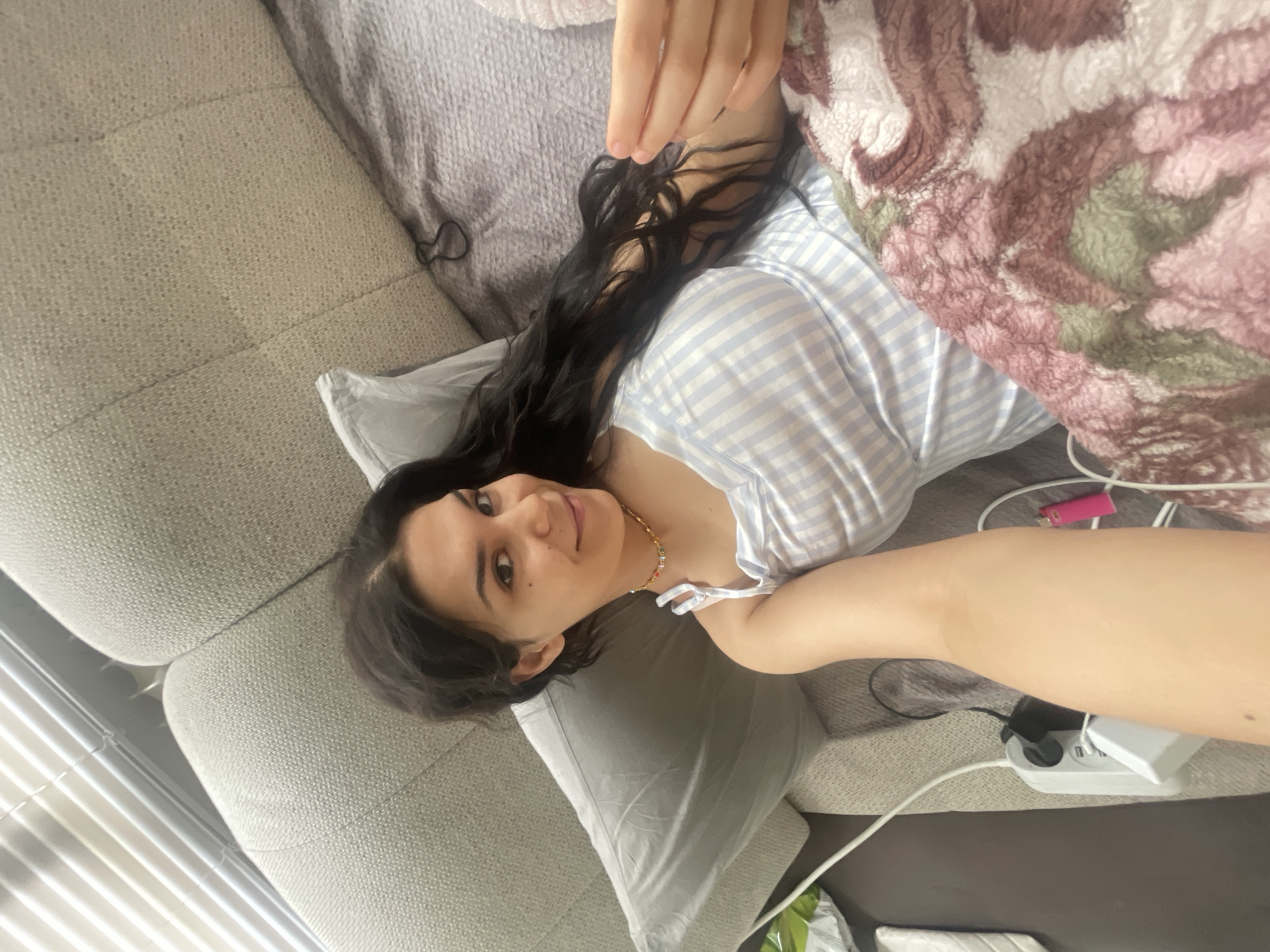 An individual is depicted reclining on a light grey upholstered sofa or bed within an indoor residence, presumed to be in Berlin, Germany. The person, appearing female, has long, dark, wavy hair and wears a light blue and white striped camisole top with a multicolored beaded choker necklace. She is looking directly at the camera with a subtle smile. Her left arm is extended towards the camera, while her right arm and lower body are partially covered by a plush blanket patterned in shades of pink, white, brown, and green. A grey pillow supports her head. Adjacent to her left side, a white power strip with multiple outlets and USB ports is visible on a grey surface, with white cables and a black adapter connected. A pink Bic lighter is also present on this surface. A dark hair tie lies on the grey bedding near her right arm. In the background, a window with horizontal blinds is partially visible, and a green and white plastic bag is near the bottom left corner of the frame.