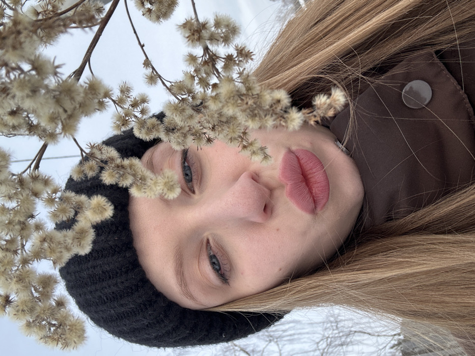 A close-up image depicts a young adult female outdoors in the city of Chaikovsky, Russia. The subject has fair skin, blue eyes, and long blonde hair, partially visible beneath a black knitted beanie. She wears a dark brown jacket or coat, featuring a visible dark grey button on the collar area. Her lips are pursed in a "kissing" gesture, highlighted with pink lipstick, and she gazes directly into the camera. Multiple branches of a dried plant with light, fluffy seed heads are positioned in the immediate foreground, partially obscuring the left side of her face and the right side of her head and upper torso. The background is out of focus, showing a light, overcast sky and faint outlines of bare trees or branches, consistent with an outdoor, cold-weather environment.