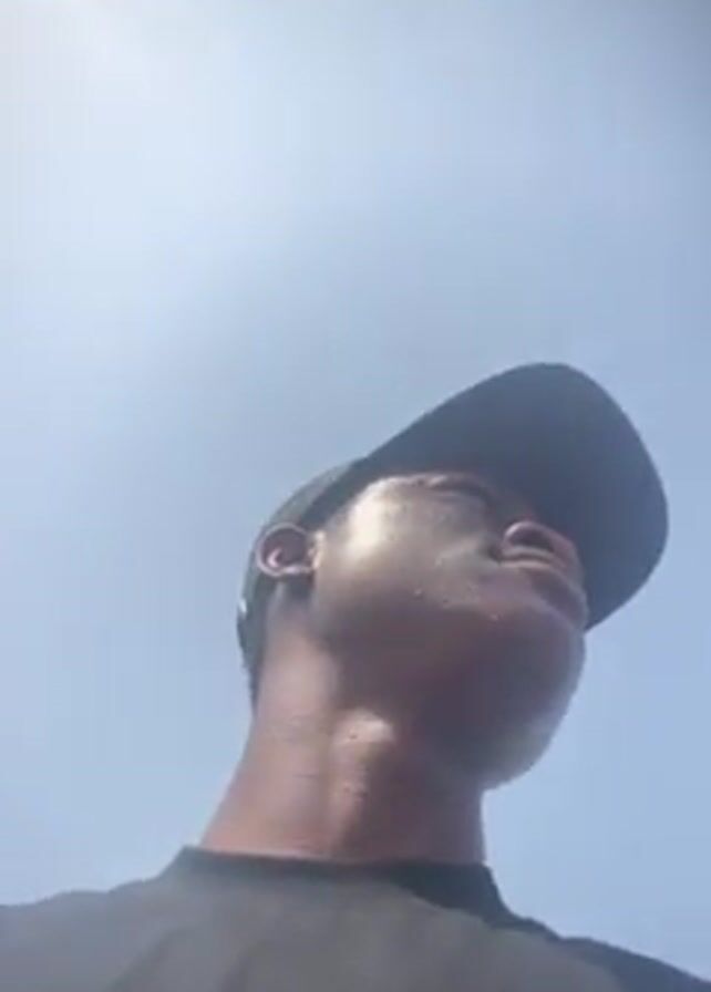 A young man wearing a black cap and black shirt is standing outside. The man's cap has a silver emblem on the front of it. The man looks up and then turns his head to face the camera. There are buildings in the background. The sky is blue.
