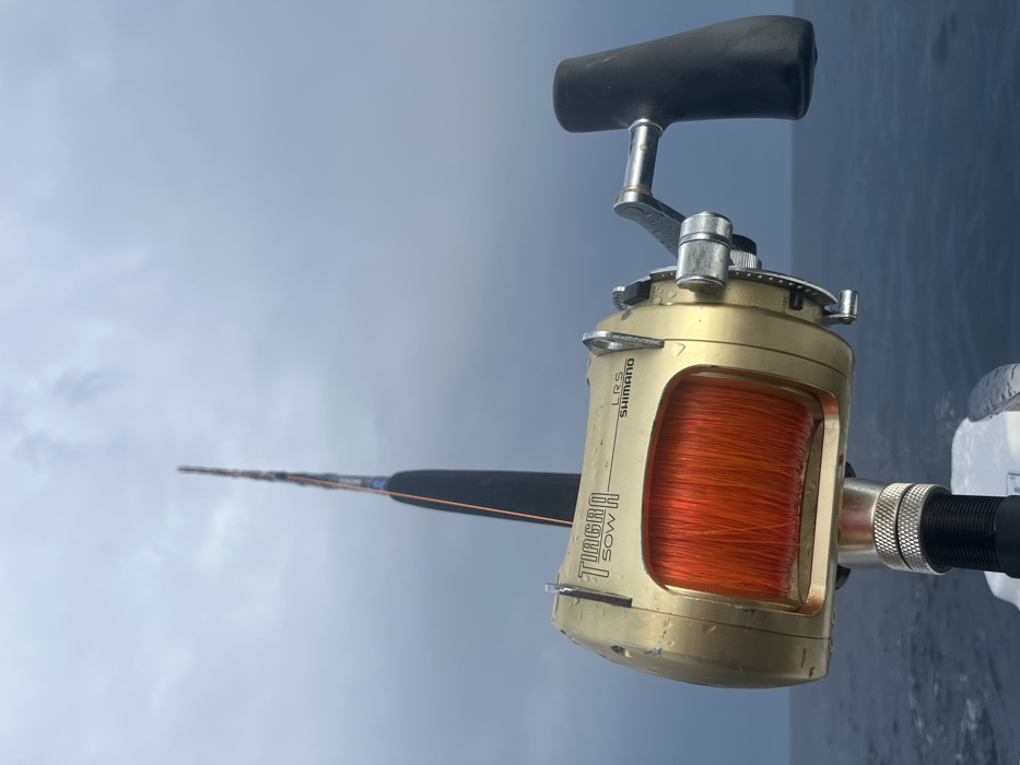 A close-up captures a gold Shimano Tiagra 50W fishing reel filled with orange line, mounted on a black fishing rod. The reel's handle is black. The background is a blurry mix of the sky with overcast, and the ocean. The reel's details, like the lettering and the line winding around the spool, are clearly visible.