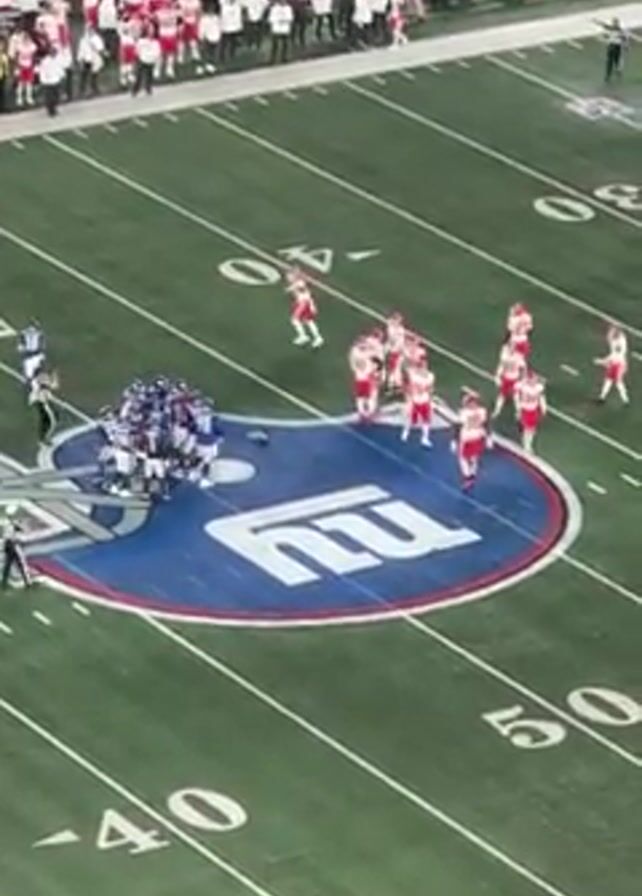bird's-eye view of an NFL football game between the New York Giants and the Kansas City Chiefs