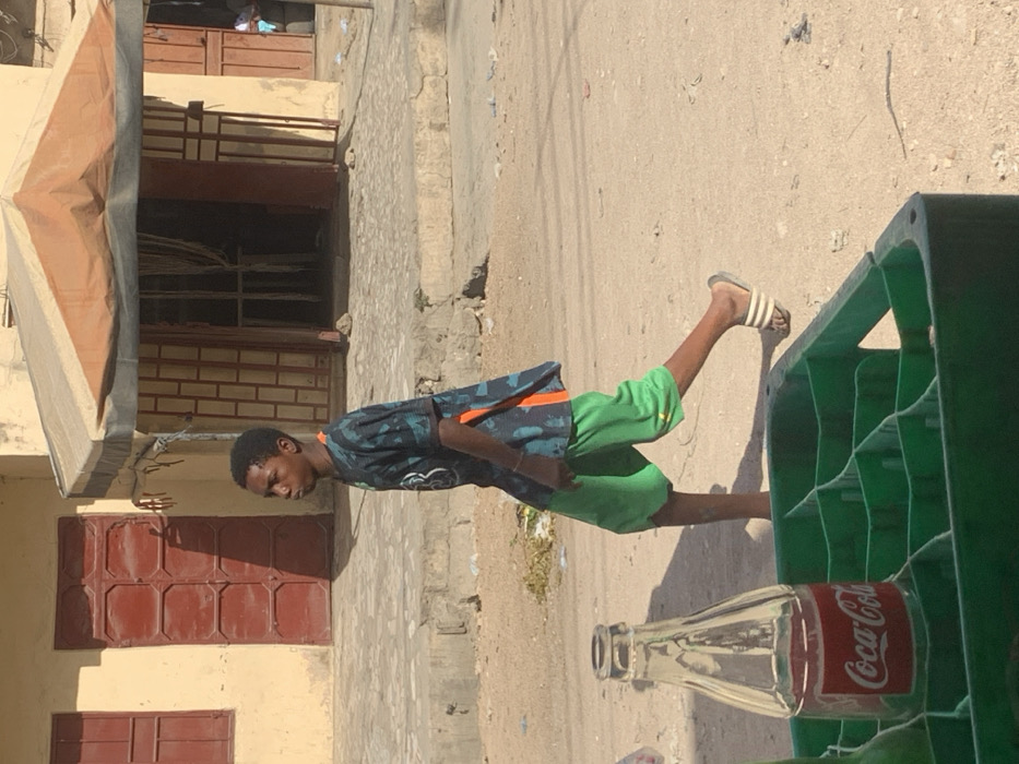 In Sabon Gari East, Nigeria, a young male is depicted mid-stride, walking from left to right across a sunlit dirt street. He wears a dark blue and orange patterned short-sleeved shirt, green shorts, and black-and-white striped slide sandals. His head is turned slightly to the right, and his mouth is slightly open. In the immediate foreground, a clear glass Coca-Cola bottle containing red liquid and bearing its red label is visible within a compartment of a green plastic beverage crate. Behind the walking male, a concrete sidewalk separates the street from two light-colored buildings. The building on the left features a large, dark red, multi-panel door and a smaller red-shuttered window. The building on the right has an entrance covered by a striped beige and orange awning, with a metal security gate visible, and another dark red door further to the right. Strong sunlight casts defined shadows.