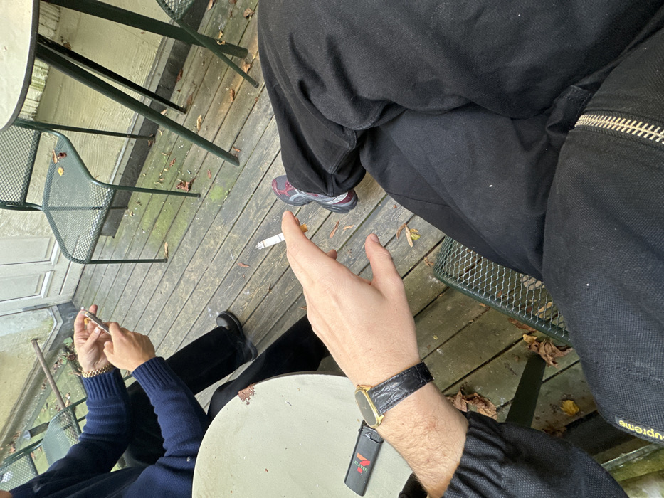 An overhead, slightly angled photograph captures an outdoor seating area on a weathered wooden deck in Frederiksberg, Denmark. The scene includes two individuals and their immediate surroundings. In the foreground, a right arm and hand are visible, belonging to the person taking the photograph. This hand holds a lit cigarette between the index and middle fingers, with a small ash column formed. On the right wrist, a gold-toned watch with a black, textured leather strap is worn. To the left of the hand, resting on a light-colored round table, is a black lighter with "7 ELEVEN" branding and red accents. The photographer's legs are partially visible in the lower right, wearing black trousers with a prominent silver zipper detail on the left thigh and a yellow "Supreme" tag visible on the inner thigh. A grey and red athletic shoe is visible on the left foot, positioned near a dark green metal mesh chair. To the left and further back, a second individual is seated, viewed from the waist down. This person wears a dark blue long-sleeved knitted sweater, dark trousers, and dark shoes. Their hands are engaged, with the left hand holding a smartphone and the right hand holding a smaller object, possibly a lighter or another cigarette. A gold-colored bracelet is visible on their right wrist. The wooden deck floor is dark, damp, and scattered with brown and yellow fallen leaves. Areas of green moss are visible on the wood. In the background, a light-colored wall features a white paneled door. Several pieces of dark green metal mesh furniture are present: a round table with two legs visible on the right, and a chair to the left of the white door.