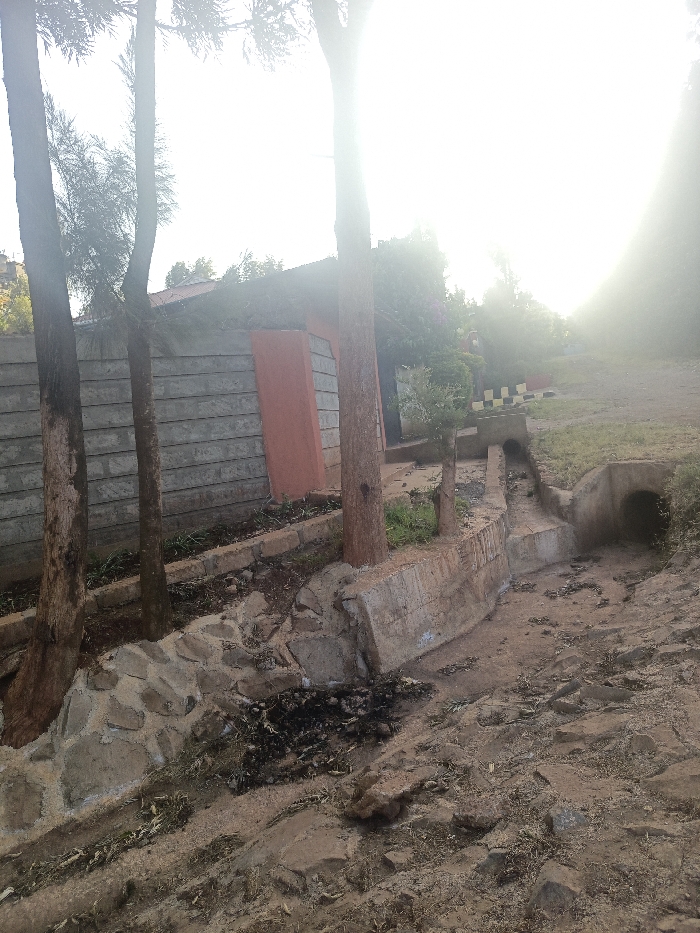 A concrete drainage ditch runs through a yard with trees and rocks. A gray concrete wall with a reddish-orange section stands to the side. The ditch leads into a tunnel. Debris is scattered along the ditch bed. The lighting is bright.