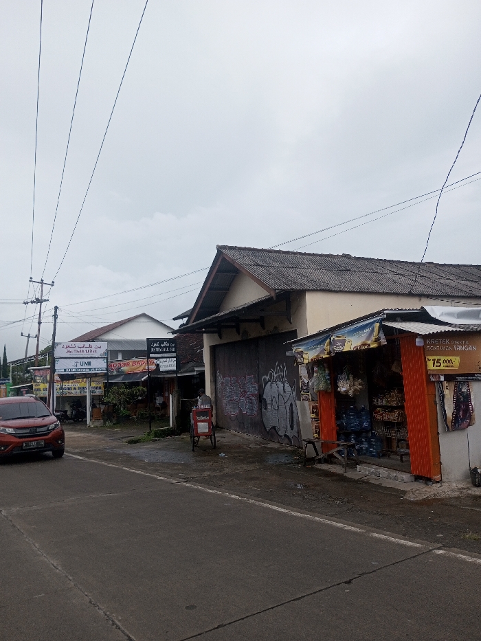 This image depicts a street scene in Sukanagalih, Indonesia, under an overcast sky