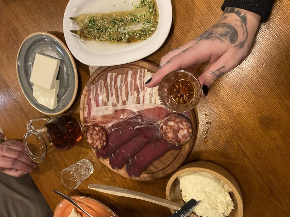 A table setting displays a charcuterie board with various cured meats, sausage, and bacon. Adjacent are plates of cheese and sauteed peppers. A person holds a shot glass of amber liquid, and a small pitcher of a similar liquid is also visible. A bowl of whipped cream or soft cheese sits next to a wooden spoon and knife. The table is made of wood.