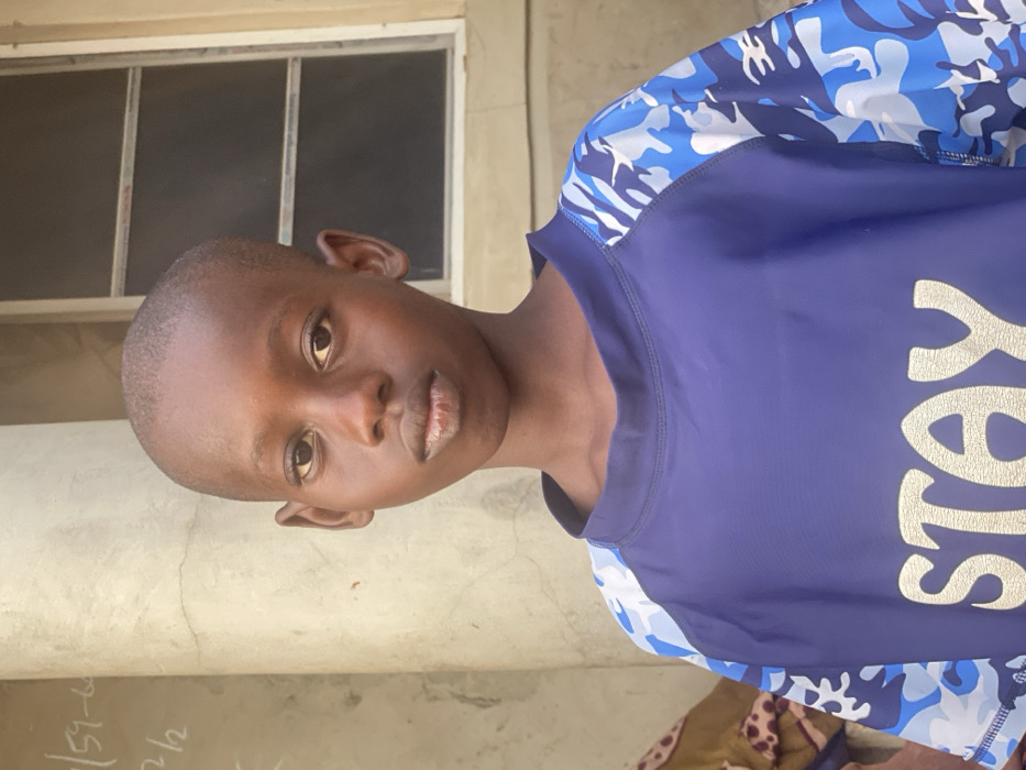 A young, dark-skinned boy faces the camera. He wears a long-sleeved, blue shirt with camouflage-patterned sleeves and the word "Stray" printed on the front. A window with multiple panes is visible in the background. The boy has a shaved head, and his expression appears neutral. The setting appears to be indoors.