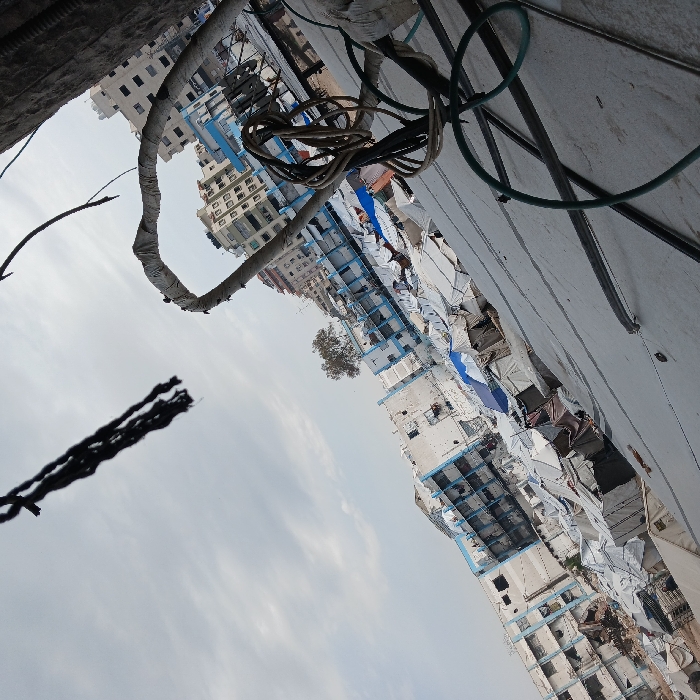 The image presents an elevated, tilted view of a densely populated informal tent settlement in Gaza City, Palestinian Territory, against a backdrop of urban structures and an overcast sky. In the immediate foreground, from the upper left, a dark, braided rope or cable hangs. To the mid-right, a prominent U-shaped object, possibly a thick cable or pipe wrapped in light-colored material, is visible. Below and around this object, a tangled cluster of various cables and wires, including black, white, and a green hose, extends towards the lower right frame. The midground is dominated by a vast expanse of closely packed, makeshift tents, predominantly white or light-colored canvas, with some featuring sections of blue tarpaulin. These tents are arranged haphazardly, indicative of an unplanned encampment. Debris and what appears to be rubble are interspersed among the tents, suggesting a disturbed or damaged ground. In the background, a large, multi-story building with a light facade and distinctive blue-painted window frames or balcony railings shows significant structural damage, including numerous holes and missing sections. To its right, further multi-story residential or commercial buildings rise, some appearing less damaged than the prominent blue-accented structure. A single tree with green foliage stands out near the horizon line. The sky above is largely overcast with a uniform light grey cloud cover. No individuals are explicitly visible within the frame.