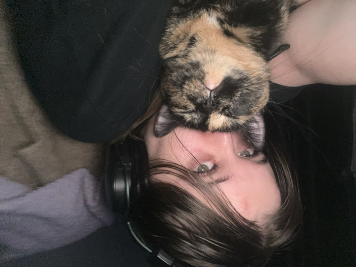 The scene takes place indoors in the city of Pushchino, Russia. A young individual with long, dark brown hair and black over-ear headphones occupies the left and central frame, looking directly towards the viewer. A minor reddish epidermal blemish is present on the individual's forehead. The individual wears a dark-colored garment. Positioned against the individual's chest and partially obscuring the lower face is a calico cat, displaying a mottled coat of black, orange, and brown patches. The cat's eyes are closed, indicating a relaxed state, and a black collar is visible around its neck. The immediate background to the left is dark and featureless. To the right, textile materials in shades of lavender and tan/brown are visible, consistent with upholstered furniture or bedding.
