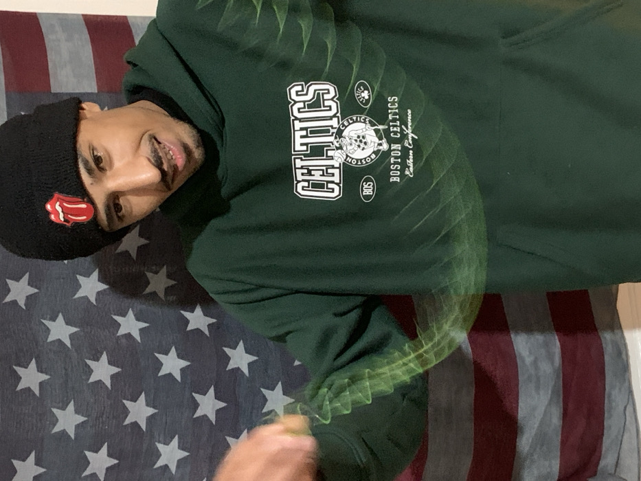 A person wearing a black beanie with a red Rolling Stones logo and a green Boston Celtics hoodie smiles. They are positioned in front of a partially visible American flag. A blurry, green, curved streak diagonally crosses the person's body, possibly due to motion or a light effect. The image is taken at an angle, with the person slightly tilted to the left.