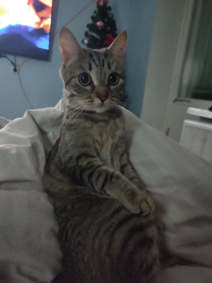 - "A striped tabby cat sits upright on a bed covered with a white blanket" by FM-sBAuS2, licensed under CC BY 4.0
