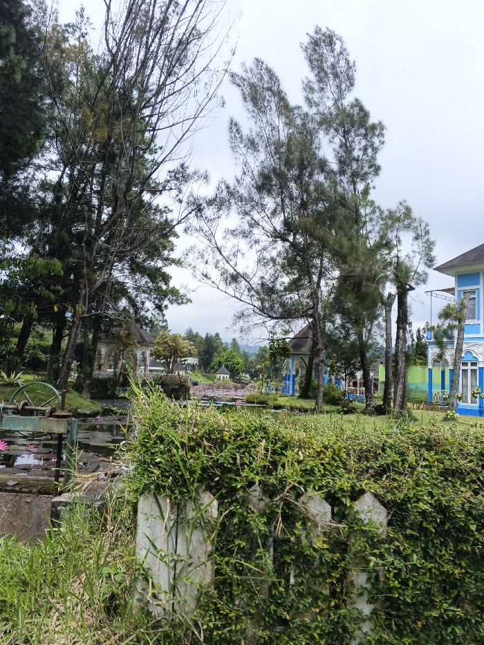The image depicts an outdoor scene within the city of Unknown, Vietnam, under an overcast sky. In the immediate foreground, a white picket fence, largely covered by dense green foliage and vines, runs horizontally across the lower portion of the frame. To the left of the fence, tall green grass is visible. Behind the fence, a murky pond or lake occupies the left midground, containing lily pads and several pink lotus flowers. An old, rusted metal wheel mechanism, possibly part of a sluice gate, is positioned on the concrete edge of the water on the far left. Beyond the water and fence, a manicured green lawn extends into the midground. Scattered across this lawn and surrounding areas are numerous tall, slender trees with dark trunks and sparse, wind-swept green foliage. In the mid-to-background, several ornate, gazebo-like structures with dark conical roofs and light-colored columns are visible, nestled among the trees. Further in the background, a narrow bridge with pink railings crosses a body of water, leading towards another small structure. On the far right, a two-story building with a light blue facade, white window trim, and intricate white decorative elements on its exterior is partially visible, topped by a dark pitched roof. Distant hills or mountains are faintly discernible through atmospheric haze in the far background. No individuals are present in the scene.