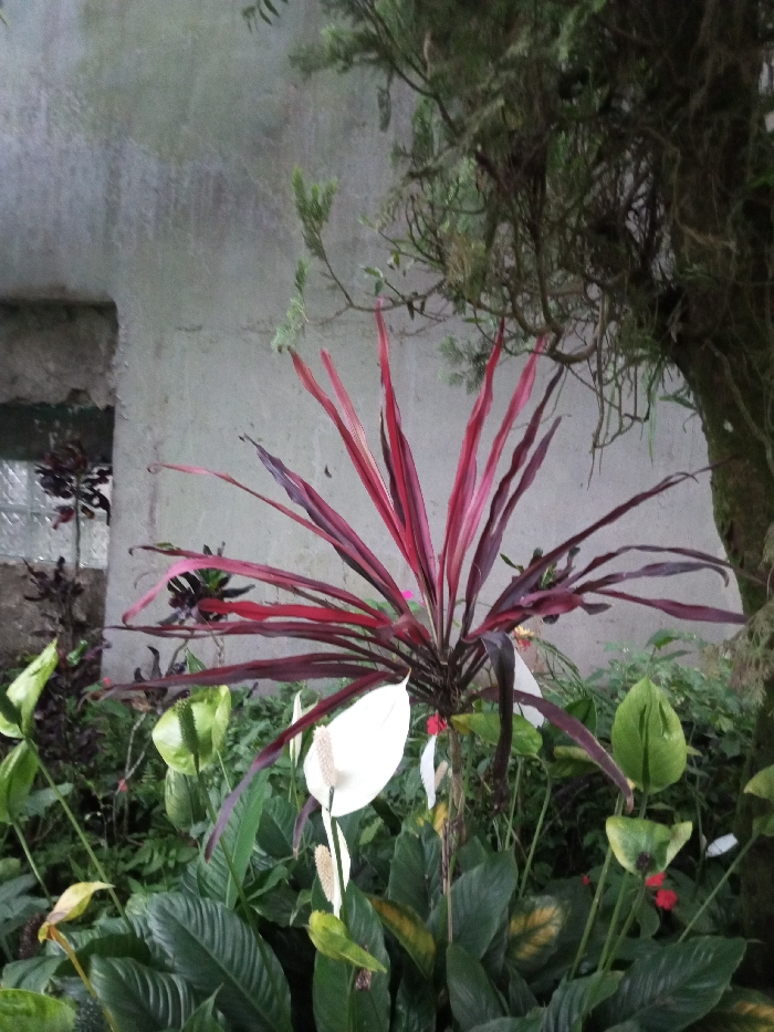 The scene depicts an outdoor garden area located in Ivato, Madagascar. In the center, a multi-stemmed plant with numerous elongated, pointed leaves displaying colors from deep red to burgundy and purple stands prominently. Below and surrounding this central plant are several peace lilies (Spathiphyllum), identifiable by their dark green foliage and distinctive white, spathe-enclosed flowers with cream-colored spadices. Other green, broad-leafed plants form a dense ground cover, and scattered small red blossoms are visible. To the right, a tree trunk, heavily covered with green moss or small epiphytes, rises from the ground, with branches extending upwards and some hanging downwards. In the background to the left, a weathered, light-colored wall, likely concrete or stucco, exhibits discolorations and texture variations. Within this wall, a recessed opening contains what appears to be a structure composed of clear or translucent glass blocks. No human or animal subjects are present, and no actions or interactions are observed. The lighting is diffuse and uniform.