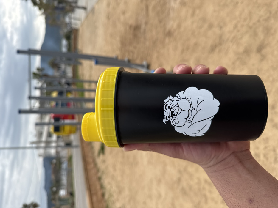 A right hand holds a matte black shaker bottle with a bright yellow screw-on lid and a yellow flip-top spout, positioned centrally in the foreground. A white graphic depicting a muscular bulldog with a spiked collar is affixed to the side of the bottle. The background is an out-of-focus outdoor scene in Port D'andratx, Spain. It features a sandy or dirt ground in the mid-ground with metal calisthenics equipment consisting of various bars and frames. Beyond the fitness equipment, a paved path is visible, followed by a blurred yellow and red vehicle. A body of water, consistent with a harbor, is discernible to the right, with distant mountains under an overcast sky. Scattered palm trees and other sparse vegetation are present in the background.