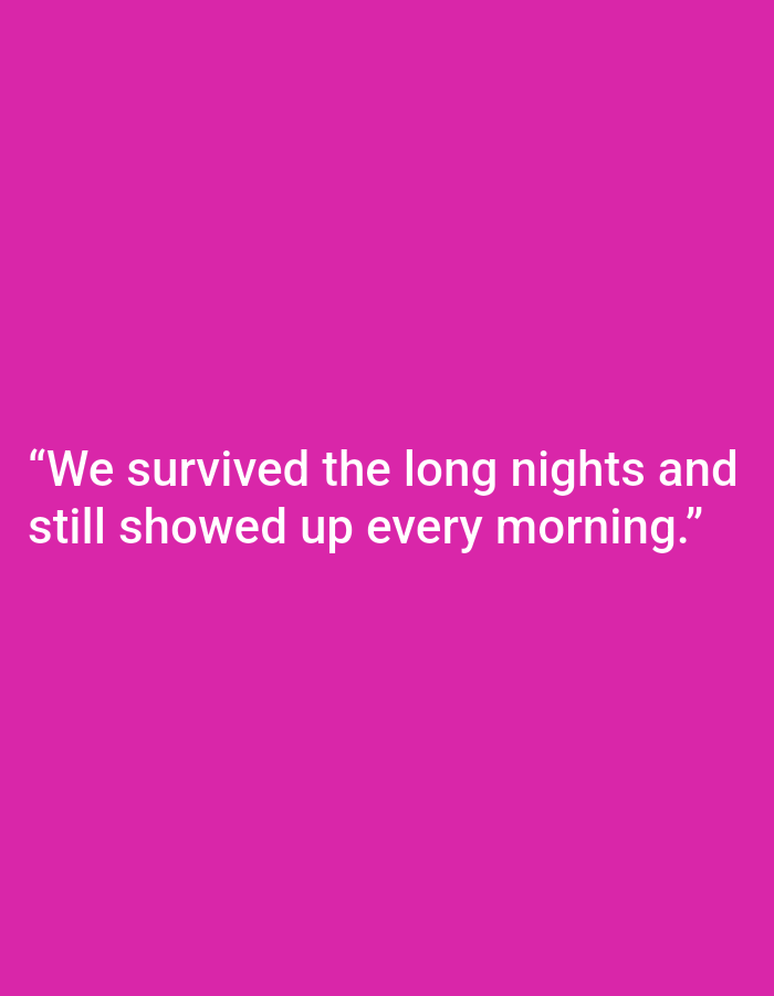 A simple, bright pink background displays a straightforward message in white text. The quote reads, "We survived the long nights and still showed up every morning." The font appears clean and legible, centered vertically and horizontally within the frame, giving a sense of balance and directness. The image conveys resilience, perseverance, and commitment.
