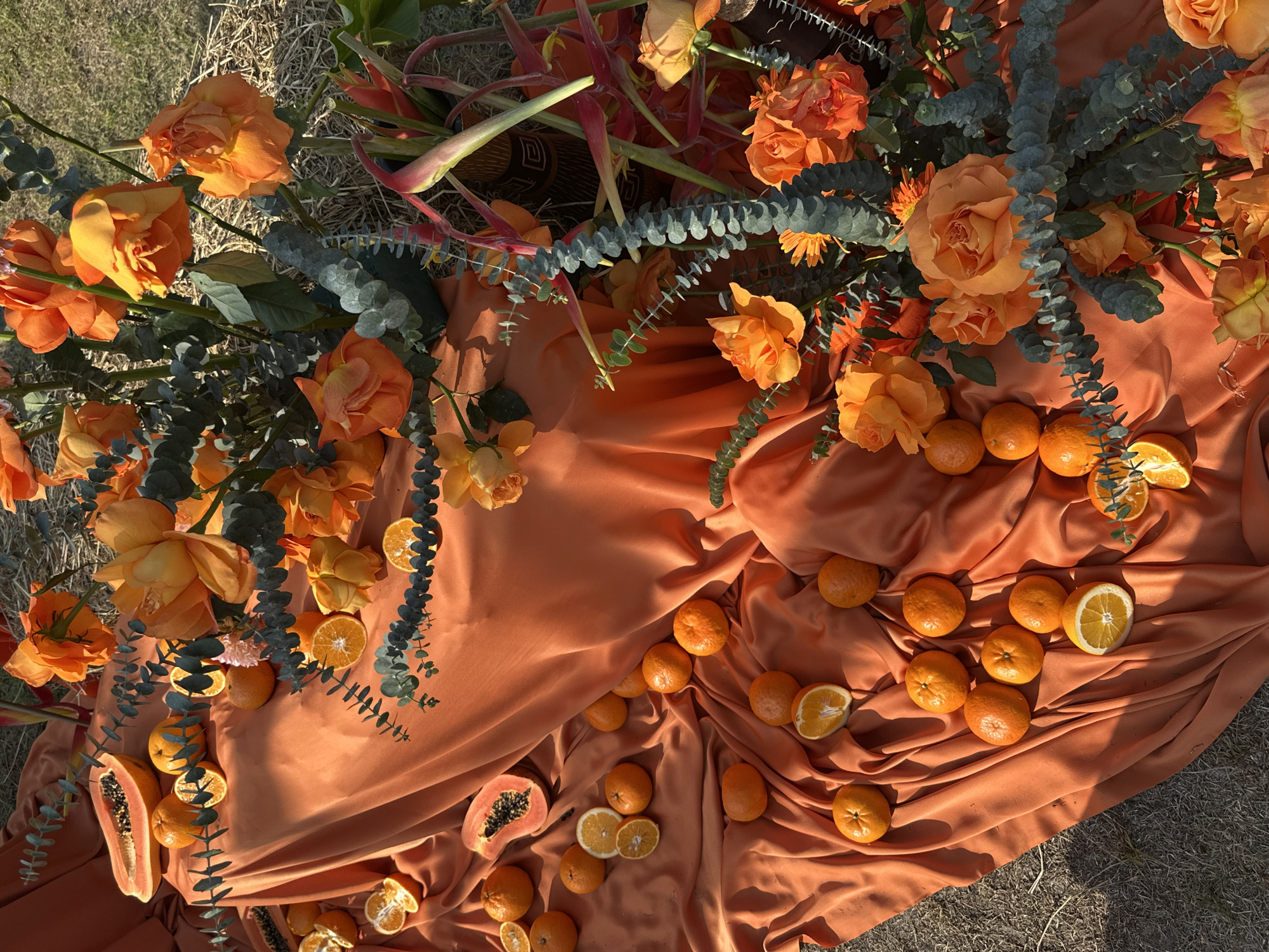 An outdoor scene in Si Sunthon, Thailand, displays a decorative arrangement predominantly featuring an orange fabric draped over an unseen structure. Dozens of whole and halved oranges are scattered across the fabric, interspersed with several papayas, including at least two cut lengthwise revealing their black seeds. Large clusters of orange roses, accompanied by green eucalyptus foliage, form prominent floral arrangements situated on and around the fabric, with some contained within dark, textured cylindrical vessels that also hold red and green tropical plants. The ground surrounding the draped fabric consists of dry grass or straw. The environment is illuminated by bright daylight, casting distinct shadows. No people are visible in the image.