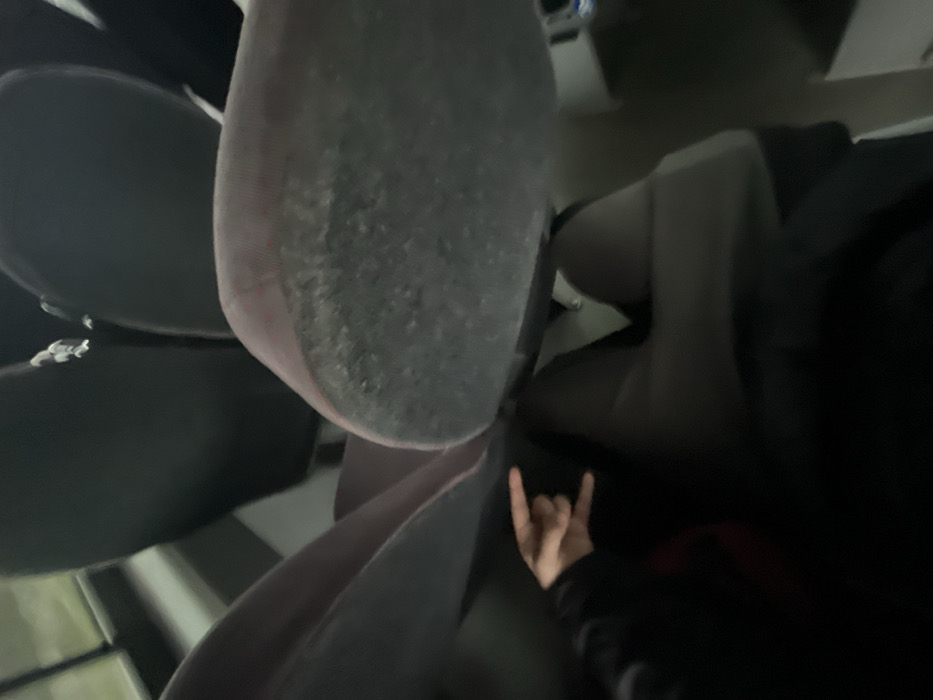 This image, taken in the city of Kovachevo, Bulgaria, presents a low-angle view within the interior of what appears to be a vehicle, likely a bus or train, characterized by multiple rows of upholstered seating. In the immediate foreground, the sole of a light-colored shoe or slipper is prominently displayed, textured and appearing worn, with its heel facing the camera. Directly beneath and to the left of the shoe, a human left hand is visible, executing a "rock on" gesture with the index and pinky fingers extended and the middle fingers curled. This hand emerges from beneath dark-colored clothing, likely trousers or sweatpants, which cover the lower extremities of an individual. Further back, out-of-focus dark grey upholstered seats are visible, suggesting multiple unoccupied or partially occupied rows. A window or external light source is partially discernable in the upper left portion of the frame, casting a subdued ambient light. The overall lighting is dim.