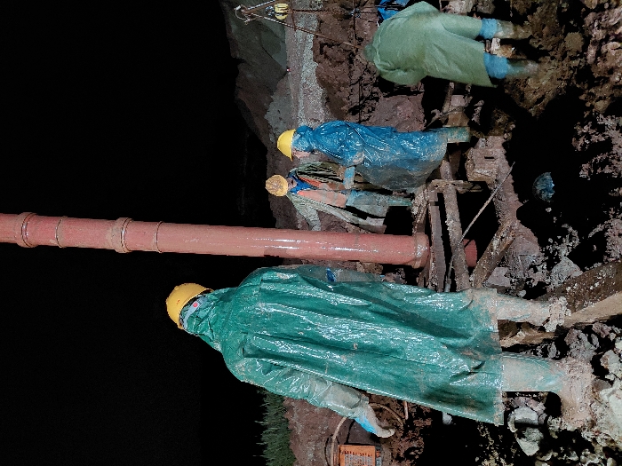 A group of construction workers wearing hard hats and protective gear appear to be working on a large pipe in a dark, possibly underground, setting. The pipe is prominently displayed in the foreground. Workers are positioned around the pipe and the surrounding area which is muddy and uneven, suggesting they might be working in a trench or excavation site. The scene seems to be lit by artificial lights. Some wooden structures are used for support.
