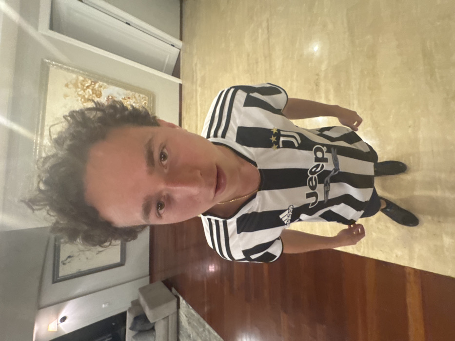 A male individual stands centrally within an indoor setting, facing directly towards the camera. He possesses dark, curly hair and maintains a neutral expression with slightly parted lips. The individual is wearing a black and white striped short-sleeve jersey featuring "Adidas" branding on the right chest, "Jeep" as a sponsor across the mid-torso, and the "J" (Juventus) emblem with three stars on the left chest. A thin gold-colored chain is visible around his neck. His lower attire consists of dark-colored shorts or trousers and dark shoes. The immediate environment features a distinct two-toned floor; the left side is a dark brown polished surface, possibly wood, while the right side is a lighter, beige-toned polished surface, consistent with stone or large tiles. In the background to the left, a light gray sofa and ottoman are positioned on a gray area rug. Above this furniture, a wall sconce provides illumination on a light-colored wall, which also displays a partially visible framed artwork. To the right in the background, a larger framed artwork with a gold-colored frame and abstract or decorative content in warm tones is mounted on the wall. A white doorway is partially visible in the far-right background. The scene depicts an interior space, consistent with a residential or commercial setting. The exact location within the city of Huixquilucan de Degollado, Mexico, is not visually discernible from the provided image. The photograph exhibits a wide-angle perspective, introducing a degree of spatial distortion.