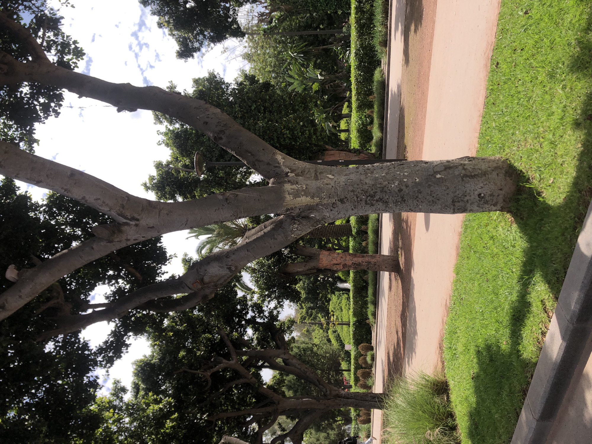 This image depicts a segment of the Parc de la Ligue Arabe in Casablanca, Morocco, captured on a clear day. The scene is dominated by lush greenery and wide, unpaved pathways. In the foreground, a dark grey concrete curb runs horizontally along the bottom left. Above this curb is a strip of manicured green grass, partially shaded. To the left, a dense clump of tall, light green ornamental grass is visible. Centrally positioned, a mature tree with rough, greyish-white bark rises, its trunk splitting into a distinctive Y-shape approximately one-third of the way up. The tree casts a shadow onto the grass. The midground features a wide pathway of reddish-brown compacted earth, curving gently from left to right. Along the pathway and beyond, numerous other mature trees with dense green foliage are present. One tree on the far right displays patches of reddish-brown on its lower trunk. A dark lamppost with a circular fixture is visible between the foreground tree and another tree to its left. On the left side of the pathway, a person dressed in light-colored pants and a dark jacket walks away from the viewer, partially obscured by a tree trunk. Beyond the pathway, a neatly trimmed green hedge separates the walking area from a more densely vegetated section of the park. Several small, round shrubs are arranged behind the hedge. The background consists of a dense array of green trees and various plants, including a palm tree visible on the far right. In the central background, a faint white spray, likely from a water feature such as a fountain, can be seen above the foliage. The sky above is partially covered with scattered white cumulus clouds against a light blue expanse. The scene is illuminated by natural daylight, casting distinct shadows. No direct interactions between individuals are discernible.