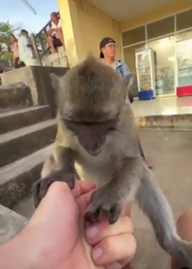 person holding a monkey in their hand. The monkey is small and gray, with dark eyes. The person is holding the monkey's hands. The monkey looks around, then looks down at the person's hand. The person offers the monkey a peanut. The monkey takes the peanut and eats it. The scene takes place outdoors, under a covered area near some steps. There are other people in the background. There is a vending machine in the background. The sky is visible in the background.