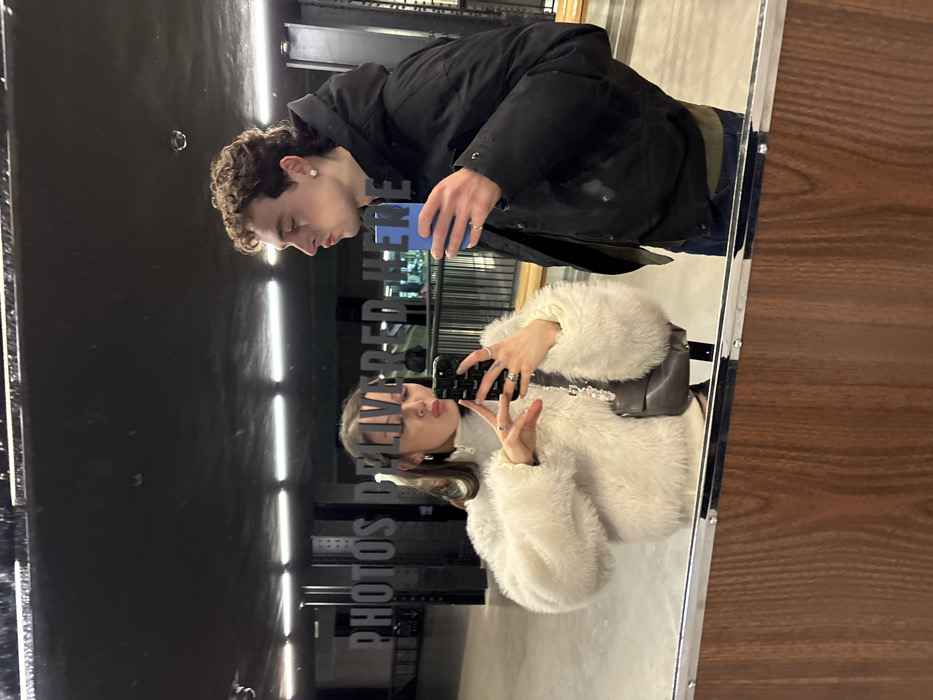 A mirror selfie captures a female and a male within The Photo Lab at Outernet, Tottenham Court Road, London, United Kingdom. The female, positioned left of frame, has light brown hair and wears a white faux fur jacket over a light-colored top, accessorized with multiple rings on her left hand. She holds a black smartphone with a dark case to actively take the photograph, presenting a pouting facial expression. A grey shoulder bag is visible hanging from her left shoulder. The male, positioned right of frame, has curly brown hair, wears a black puffer jacket over a dark olive green top, and has a small stud earring in his left ear. He holds a blue smartphone in his right hand and exhibits a pouting expression, directing his gaze slightly to the left. The reflected background shows a dark, industrial interior featuring horizontal strip lighting on the ceiling and large, reflective wall surfaces. The text "PHOTOS DELIVERED HERE" is prominently displayed in reverse on a reflective surface behind the subjects, indicating the specific location. Metal railings and an expansive, modern architectural layout are also discernible in the reflections.