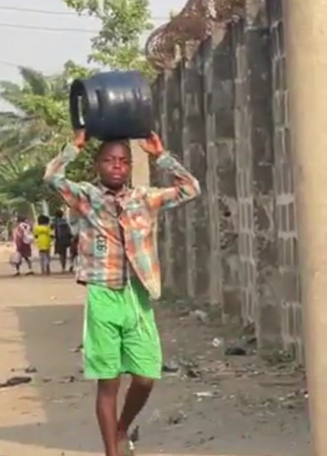 A young dark-skinned person wearing a plaid shirt, green shorts, and sandals is carrying a small black propane tank on their head as they walk along a dirt path