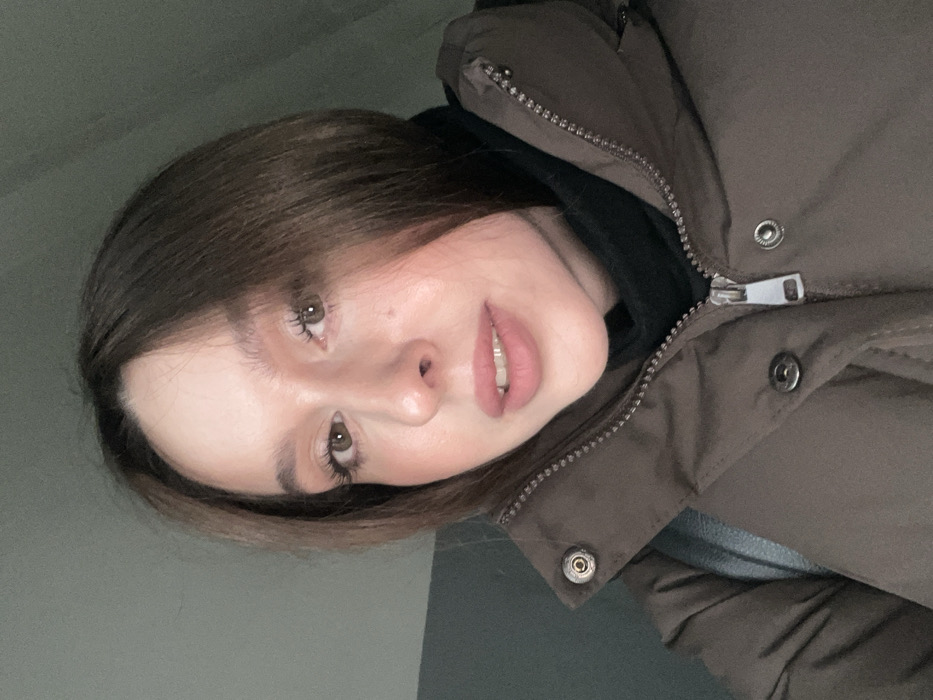 A young woman with fair skin, light brown hair, and brown eyes is angled slightly towards the camera. She wears a black hooded sweatshirt underneath a brown, quilted jacket. The jacket is zipped up to the collar, with several metal snaps visible on the lapel. The background appears to be a plain, grey wall. Her lips are a soft pink.