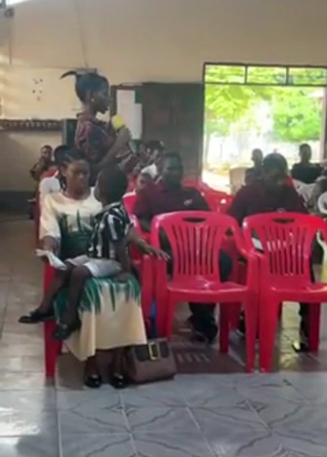 A woman is standing, holding a microphone, speaking to a group of seated people. The speaker is wearing a patterned top and has her hair pulled back. A woman is seated in front of the speaker, holding a small child on her lap. The seated woman is wearing a dress with light and dark patterns. The child is wearing a black and white striped shirt and shorts. Several people are seated in red plastic chairs behind them, some wearing maroon shirts. The room has tiled floors, a ceiling fan, and a window in the background. The atmosphere appears to be inside a meeting hall or church.