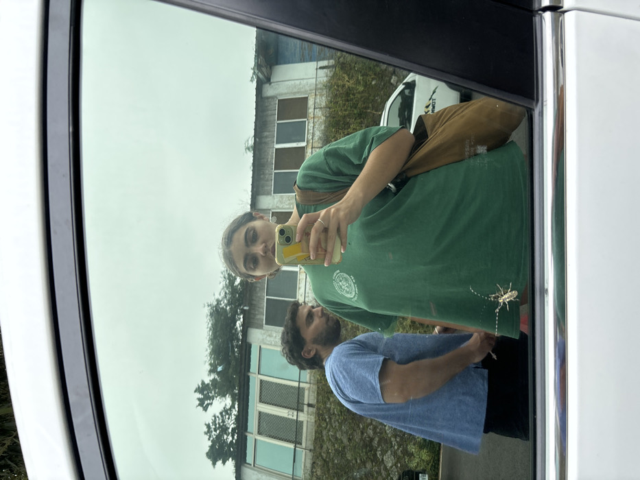 The image depicts a reflection selfie taken through the passenger side window of a white vehicle in Meishan Township, Taiwan