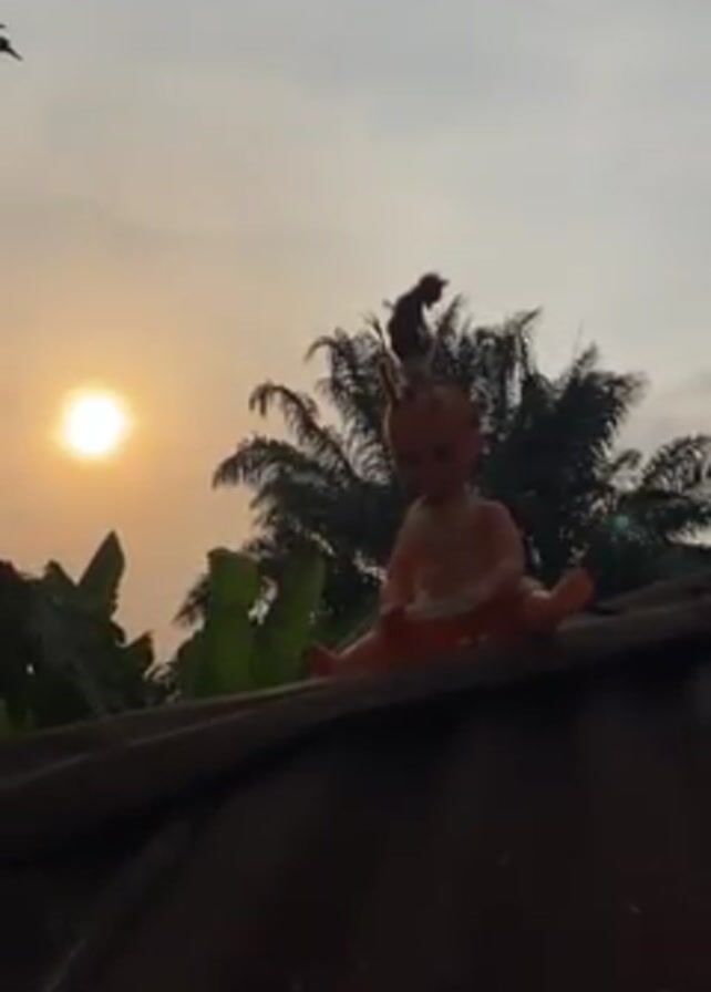 doll sitting on a roof at sunset. The doll is plastic and has a creepy appearance. There is a bird on its head. Palm trees and banana trees are in the background. The sun is bright, setting behind the trees.